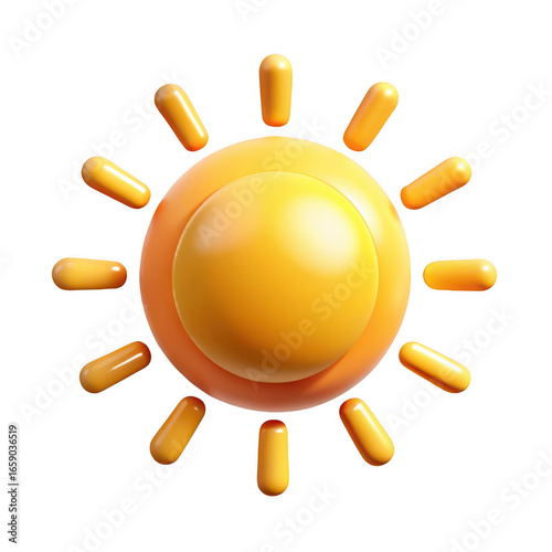 Bright yellow cartoon sun with rounded rays radiating warmth and light isolated on transparent background