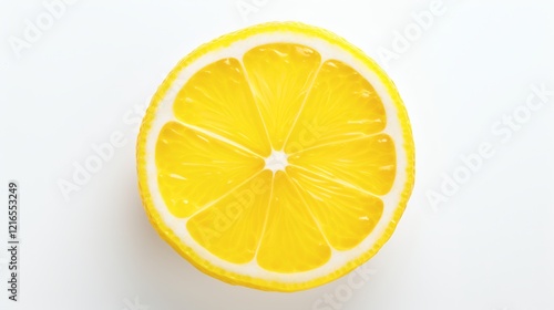 Bright yellow lemon slice displays vibrant color and texture against a white background, highlighting its juiciness and freshness