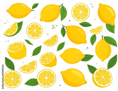 Bright yellow lemon slices and whole lemons, with green leaves, scattered on a white background