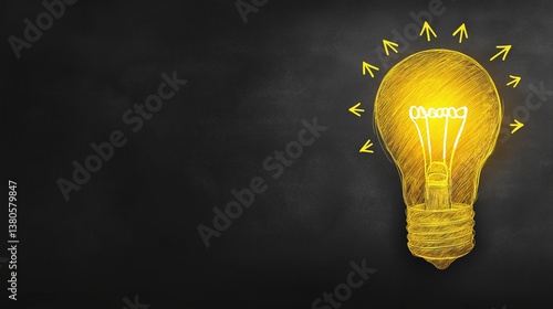 Bright Yellow Light Bulb Illustration on Dark Background with Arrows Symbolizing Ideas and Creativity