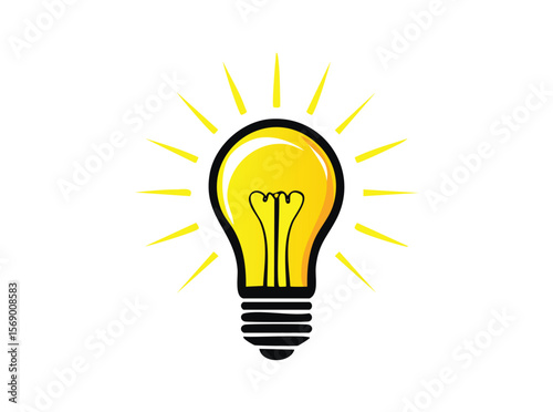Bright Yellow Light Bulb Shining with Rays of Light on White Background