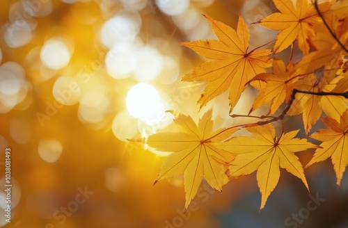 Bright yellow maple leaves illuminated by warm autumn sunlight in a serene natural setting