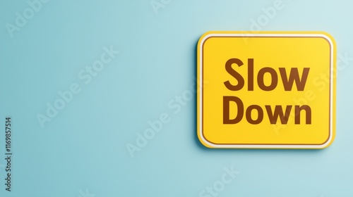 Bright Yellow Slow Down Street Sign at Child's Eye Level Against Light Blue Background for Road Safety Awareness