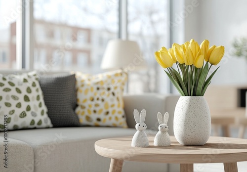 Bright yellow tulips in a vase on a coffee table with decorative bunnies in a cozy living room