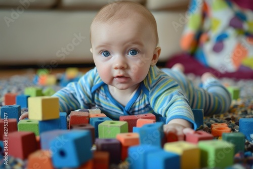 Brighteyed infant engaging in playtime with a vibrant set of educational foam blocks