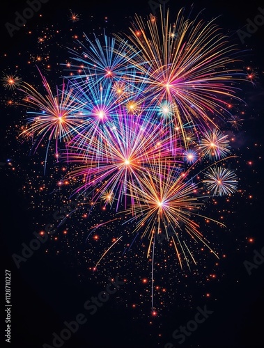 Brightly colored fireworks bursting across the night sky, vibrant sparks, nighttime fireworks display