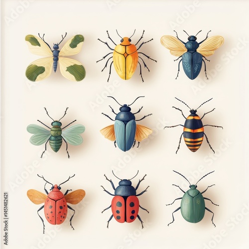Brightly colored illustrations of various insects displayed in a grid pattern on a light background, showcasing their unique features and designs