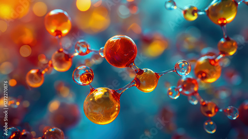 Brightly colored molecular formations showcase vibrant oranges and yellows against a blue backdrop, creating a mesmerizing scientific visualization of chemistry or biology.