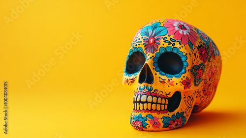 Brightly colored skull representing Day of the Dead celebration on a vibrant yellow backdrop
