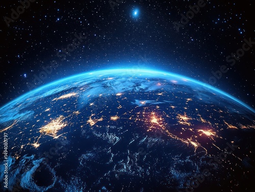 Brightly illuminated Earth surface at night showing city lights under a starry sky with a glowing blue atmosphere