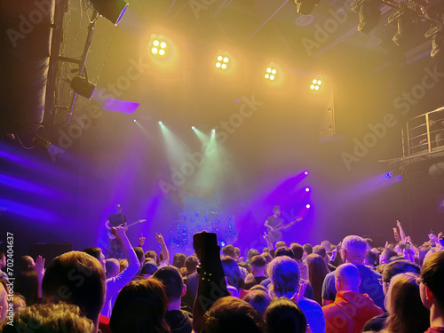 Brightly lit scene of a rock concert. There are many spectators in the hall