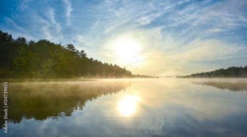 Brilliant and bright mid-summer sunrise on a lake. Warm water and cooler air at daybreak creates misty fog patches. Still water along a calm, quiet Ontario lakeside.