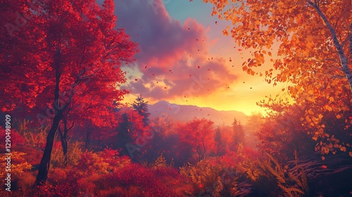 Brilliant light shines through vibrant red leaves in autumn Image