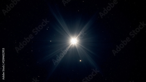 Brilliant white star radiating intense light against the vast darkness of space. Surrounded by smaller distant stars, its glowing rays extend outward, creating a sense of tranquility.