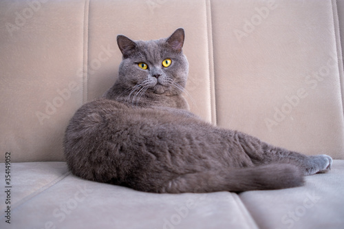 British shorthair cat, blue-gray color with orange eyes. Lying on the sofa and looking at camera.