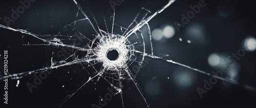 Broken glass pane with a bullet hole captured in clear detail against a dark background highlighting the impact of violence