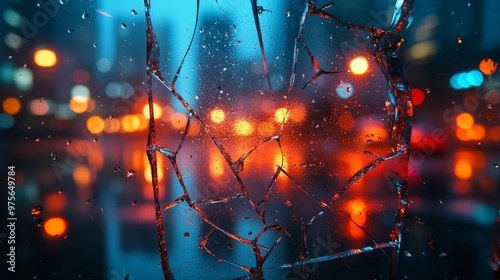 Broken Glass Window on a Rainy Night with Bokeh Lights Generative AI