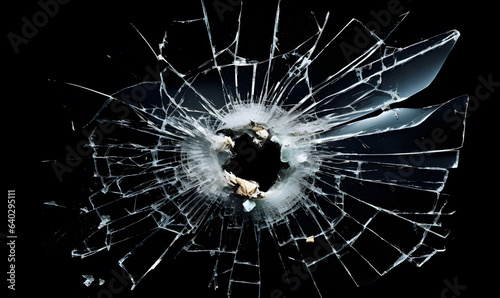 Broken glass with hole due to gunshot. Concept of fragility and violence.