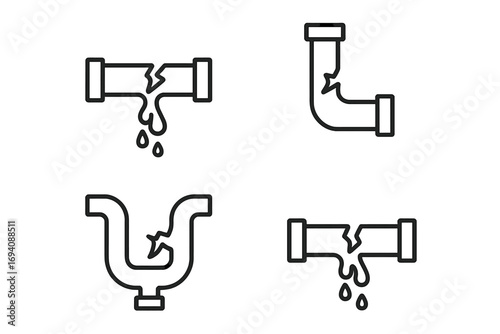 Broken pipes line icon set. Leaking water pipe, plumbing problem concept. Damaged pipeline, burst pipework vector illustration. Emergency repair service graphic element.