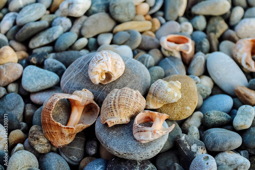 broken shells and smooth pebble stones on the seashore