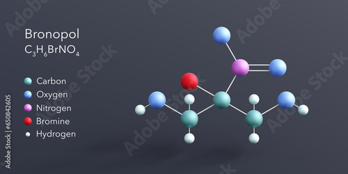 bronopol molecule 3d rendering, flat molecular structure with chemical formula and atoms color coding