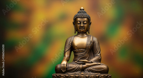 Bronze Buddha statue, seated in meditation, against a blurred earthy background. Represents peace, serenity, and spiritual enlightenment. Ideal for mindfulness concepts