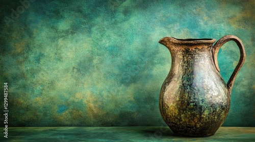 Bronze pitcher with a hammered texture sitting on a rich green background.