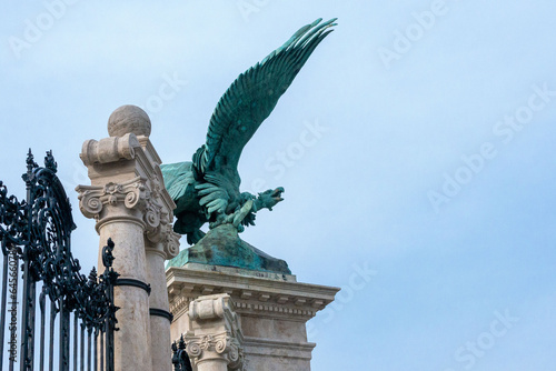 Bronze statue eagle, of the mythological bird Turul on the gate of Buda Palace against the blue sky.