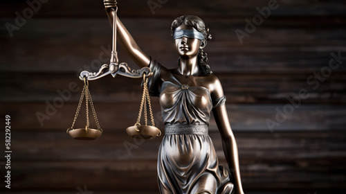 Bronze statue of Themis, Goddess of Justice holding Law Scales. Copy space. Based on Generative AI