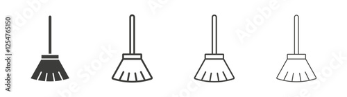 Broom icons set. Liner outlined and flat black color