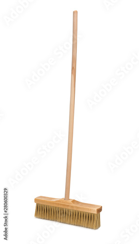 Broom with long wooden handle isolated on white background. Cleaning equipment for housework