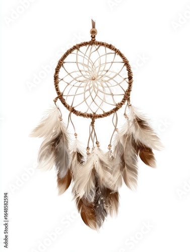 Brown and Beige Dreamcatcher with Feathers on White Background