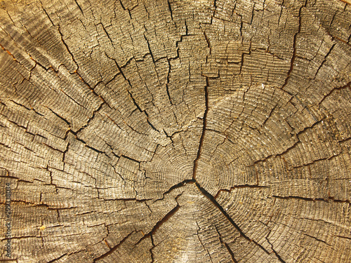 Brown background large circular piece of wood cross section with tree ring texture pattern and cracks. Backdrop detailed organic nature surface