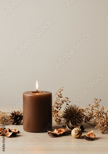 Brown Candle with Dried Flowers and Pine Cones Autumnal Still Life Photography