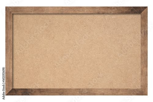 Brown cork board, note pinboard with unpainted natural wooden frame isolated on white background