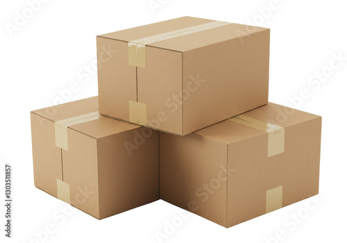 Brown corrugated cardboard boxes stacked together sealed with packing tape isolated on transparent background