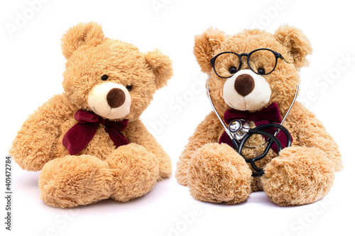 Brown doctor teddy bear with eye glasses and medical stethoscope with patient isolated on white background.