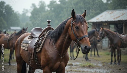 Brown horse with a saddle standing in the rain at a ranch with other horses in the background