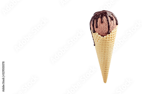 Brown ice cream in crisp waffle cone with chocolate sauce isolated on white background, mock up for design.