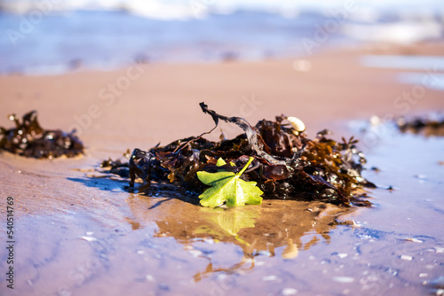 Brown seaweed with a green leaf in beach sand with a beach water background