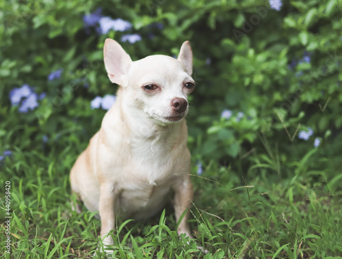 brown short hair Chihuahua dog sitting on green grass in the garden, looking sideway sadly at camera. Dog behavior concept.