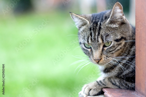 Brown tabby cat lying in the garden with curious look. Selective focus, beautiful green bokeh.