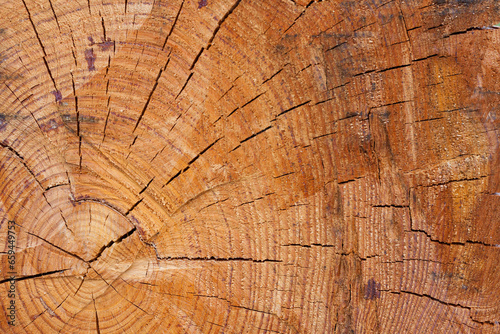 brown timber structure. cutted tree Ideal round cut down. with annual rings and cracks. Wooden texture.