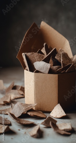 Brown triangular chocolate pieces spilling from a kraft paper box