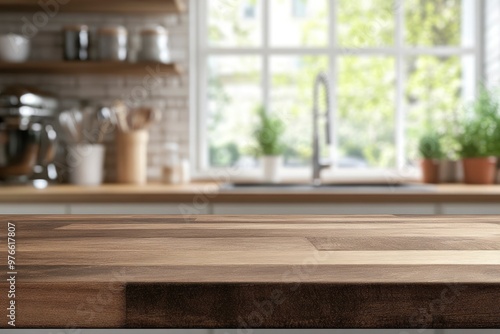 Brown wood table top over blurred kitchen counter interior background with window, ai