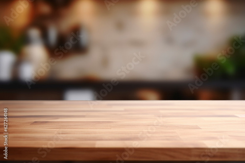brown wooden table top kitchen interior background in and blurred defocused with daylight flare bokeh, product montage display, generative ai