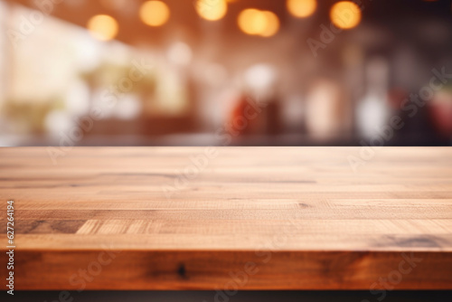 brown wooden table top kitchen interior background in and blurred defocused with daylight flare bokeh, product montage display, generative ai