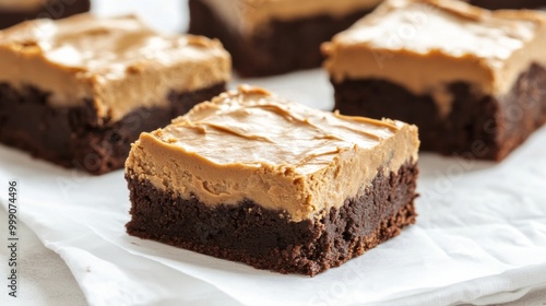 Brownie squares with a layer of peanut butter, served on a white napkin generative ai