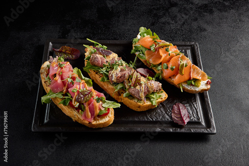 Bruschetta set with salmon, roast beef, and tuna on a black rectangular plate