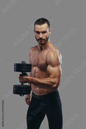 Brutal athletic bearded shirtless male doing exercise with dumbb
